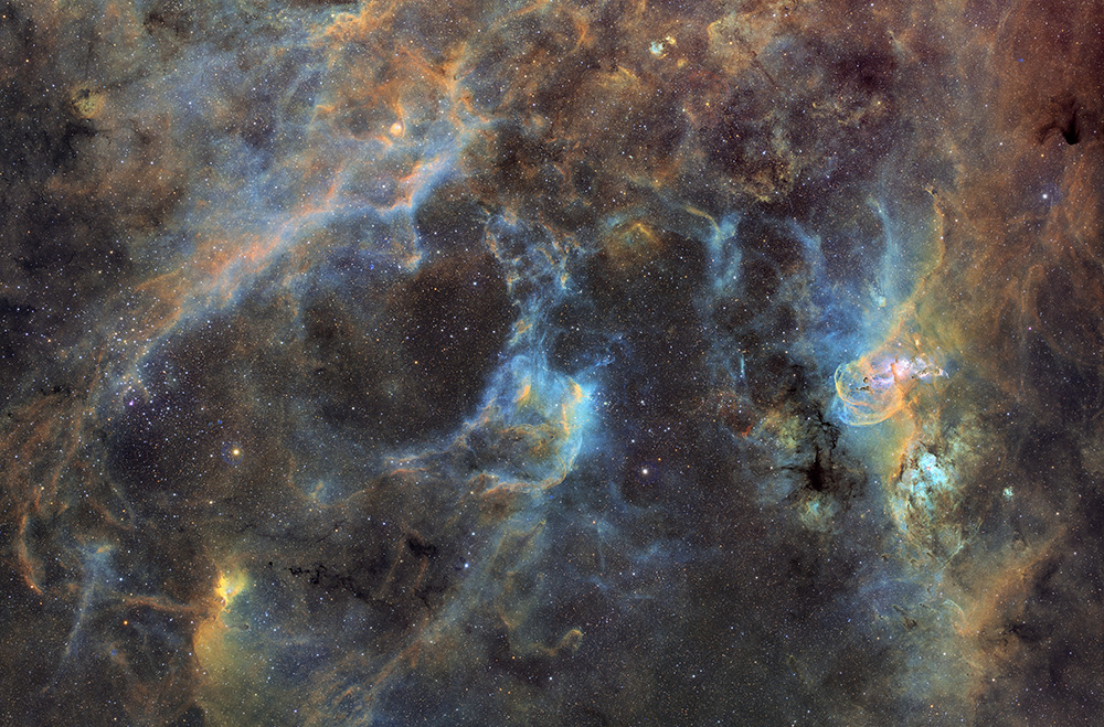 NGC 3579 n'est qu'un élément du tableau. Il s'agit d'une région géante de formation d'étoiles située en direction de la constellation de la Carène, dominée par un champ dense d'étoiles dans le bras spiral du Sagittaire de la Voie lactée. Toutes se trouvent à une distance moyenne d'environ 9 000 années-lumière du Système solaire. Les jeunes étoiles massives issues de la matière de la nébuleuse émettent de puissants vents magnétisés, à l'origine de l'image que nous voyons. Voici la liste des nébuleuses de la région. Six parties très brillantes de la nébuleuse ont été classées au XIXe siècle. La nébuleuse entière s'étend sur un degré du ciel et a un diamètre de 100 années-lumière. Cette liste comprend également la nébuleuse NGC 3603, beaucoup plus lointaine, située dans la même zone du ciel. Cette nébuleuse n'est que la partie la plus brillante d'une immense région nébuleuse qui s'étend probablement sur 1 000 années-lumière. NGC 3572 est une nébuleuse très colorée. Ce portrait cosmique chromatique présente du gaz brillant et de la poussière sombre à proximité de certaines des étoiles nouvellement formées de NGC 3572, un amas d'étoiles peu étudié près de la nébuleuse de la Carène. Les étoiles de NGC 3572 sont visibles vers le bas de l'image, tandis que le nuage de gaz en expansion au-dessus est probablement ce qui reste de sa nébuleuse en formation. Les teintes saisissantes de l'image ont été créées grâce à des couleurs spécifiques émises par l'hydrogène, l'oxygène et le soufre, combinées à des images enregistrées avec des filtres rouge, vert et bleu à large bande. Cette nébuleuse proche de NGC 3572 s'étend sur environ 100 années-lumière et se trouve également à environ 9 000 années-lumière dans la constellation australe de la Carène (la Quille du Navire). D'ici quelques millions d'années, le gaz qu'il représente se dispersera probablement, tandis que les collisions gravitationnelles disperseront probablement les étoiles de l'amas sur environ un milliard d'années.